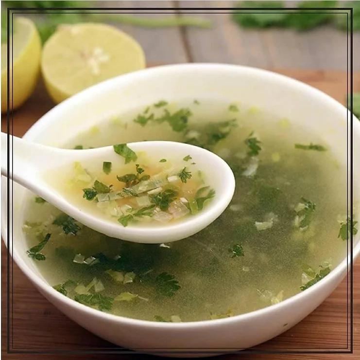 For lemon and coriander soup To make lemon and coriander soup, heat the oil in a deep non-stick pan, add the garlic and green chillies and sauté on a medium flame for a few seconds. Add the onions and sauté on a medium flame for 1 to 2 minutes. Add the cabbage and carrots and sauté on a medium flame for 1 minute. Add the basic vegetable stock, lemon juice, salt and cornflour-water mixture, mix well and cook on a medium flame for 2 to 3 minutes, while stirring occasionally. Add the coriander and mix well. Serve the lemon and coriander soup immediately.